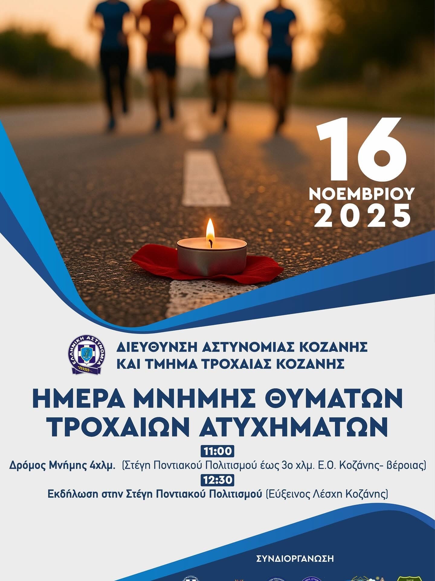 Με αφορμή την «Παγκόσμια Ημέρα Μνήμης για τα Θύματα Τροχαίων Ατυχημάτων», η Διεύθυνση Αστυνομίας Κοζάνης και το Τμήμα Τροχαίας Κοζάνης, σε συνεργασία με την Ένωση Αστυνομικών Υπαλλήλων Κοζάνης, διοργανώνουν για 3η συνεχόμενη χρονιά τις δράσεις ενημέρωσης και ευαισθητοποίησης με τίτλο: